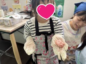 お肉をこねこね…「冷たい~😆」「感触が~😖」などと盛り上がりながらみんなでハンバーグのタネをこねました😂✨
