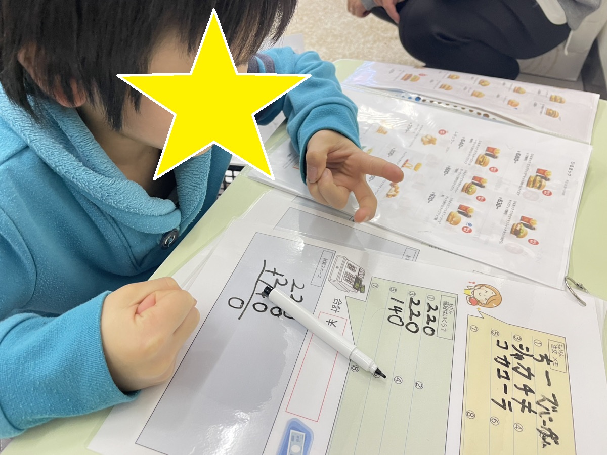 金額が分かったら合計金額の計算をします!暗算でできる子もいればひっ算で計算する子、電卓を使う子もいます!それぞれのやり方で答えを出していきます😊