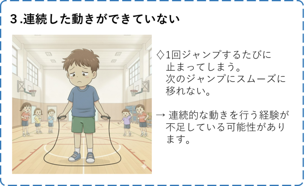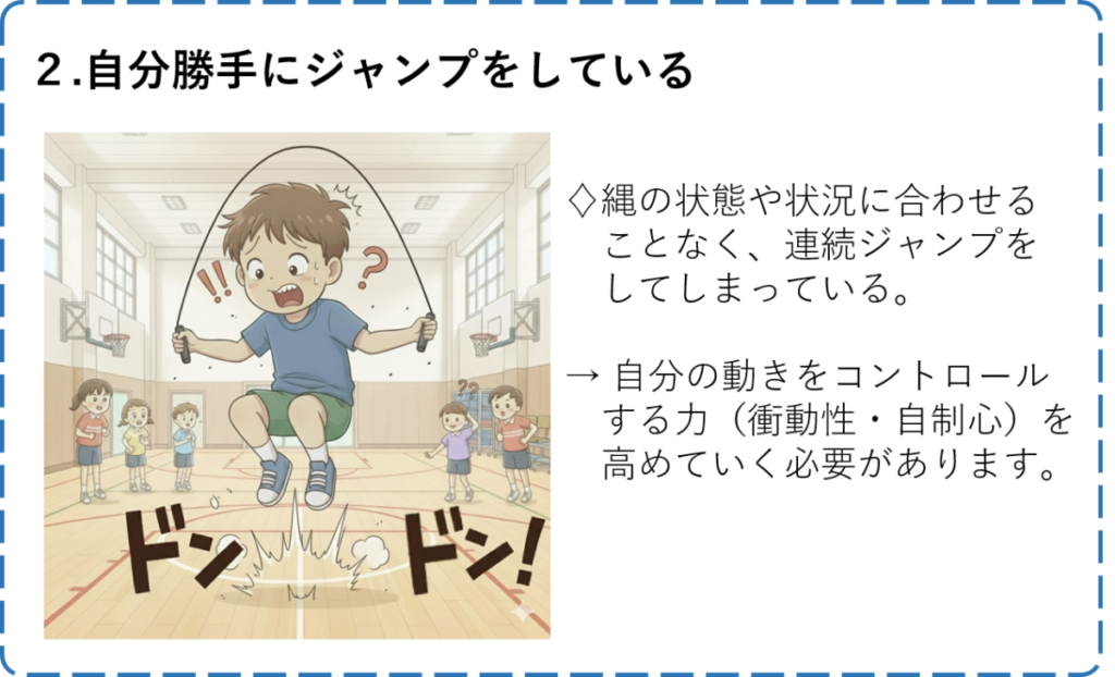 しかし、お子さんによっては「もうヤダ!」とネガティブな気持ちになってしまうことがあります。まずは、お子さんの「跳んでいる時の動き」を観察してみましょう!