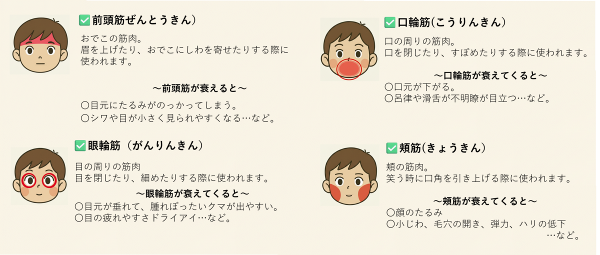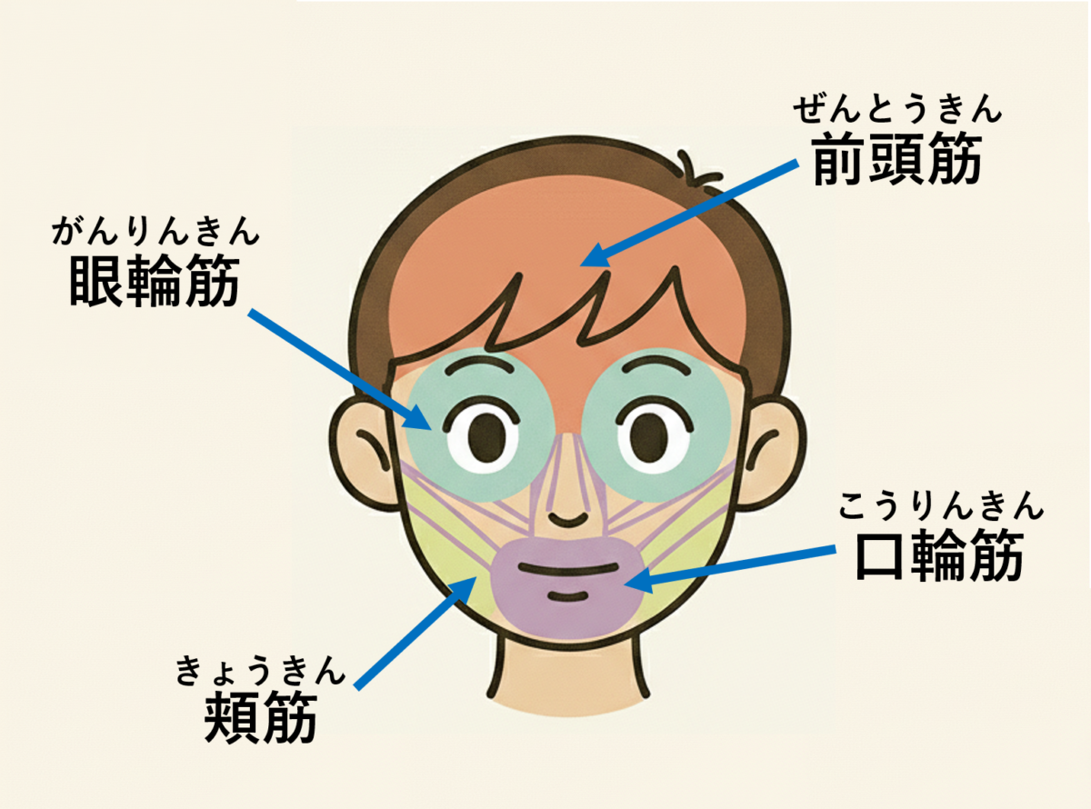 なので、鏡を見た時に大きく動く「おでこ/目/口/頬の筋肉」と覚えてもらえるだけでも、意識するポイントが抑えられやすくなるかと思います♪
