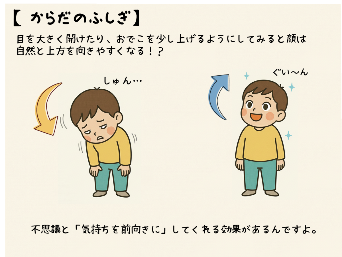 たとえば、気分が落ち込んでいる時、自然とうつむきがちになりますよね。そんな時、少し意識して顔を上げてみましょう。