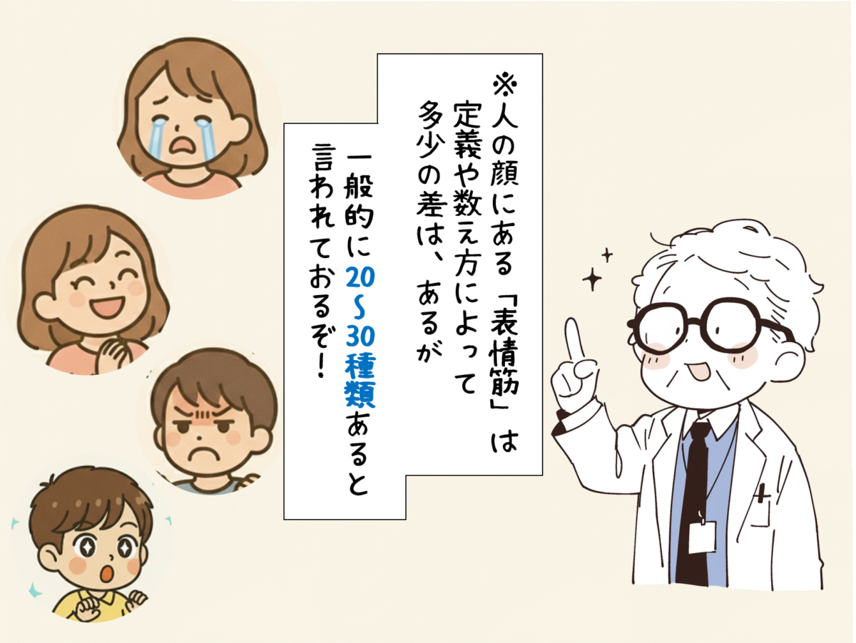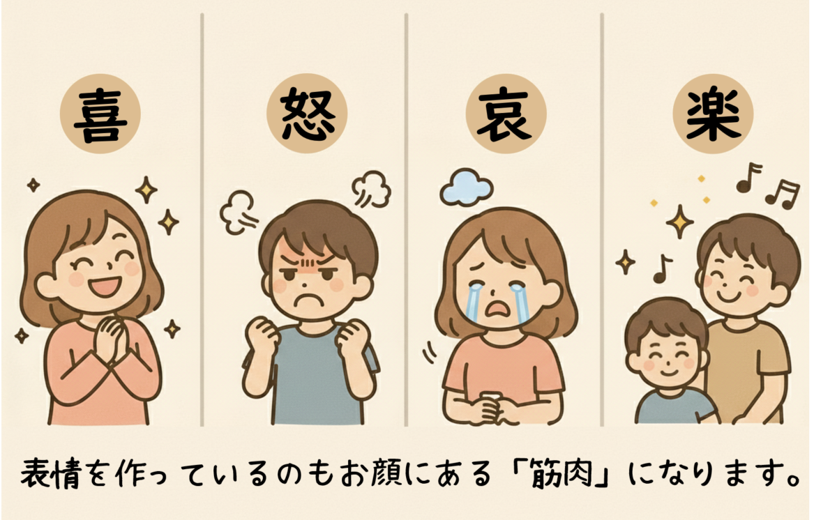 こぶしや腹筋と同様に、顔にも「表情筋」と呼ばれる様々な筋肉が連動して動く事で、喜怒哀楽や様々な表現が可能となります!